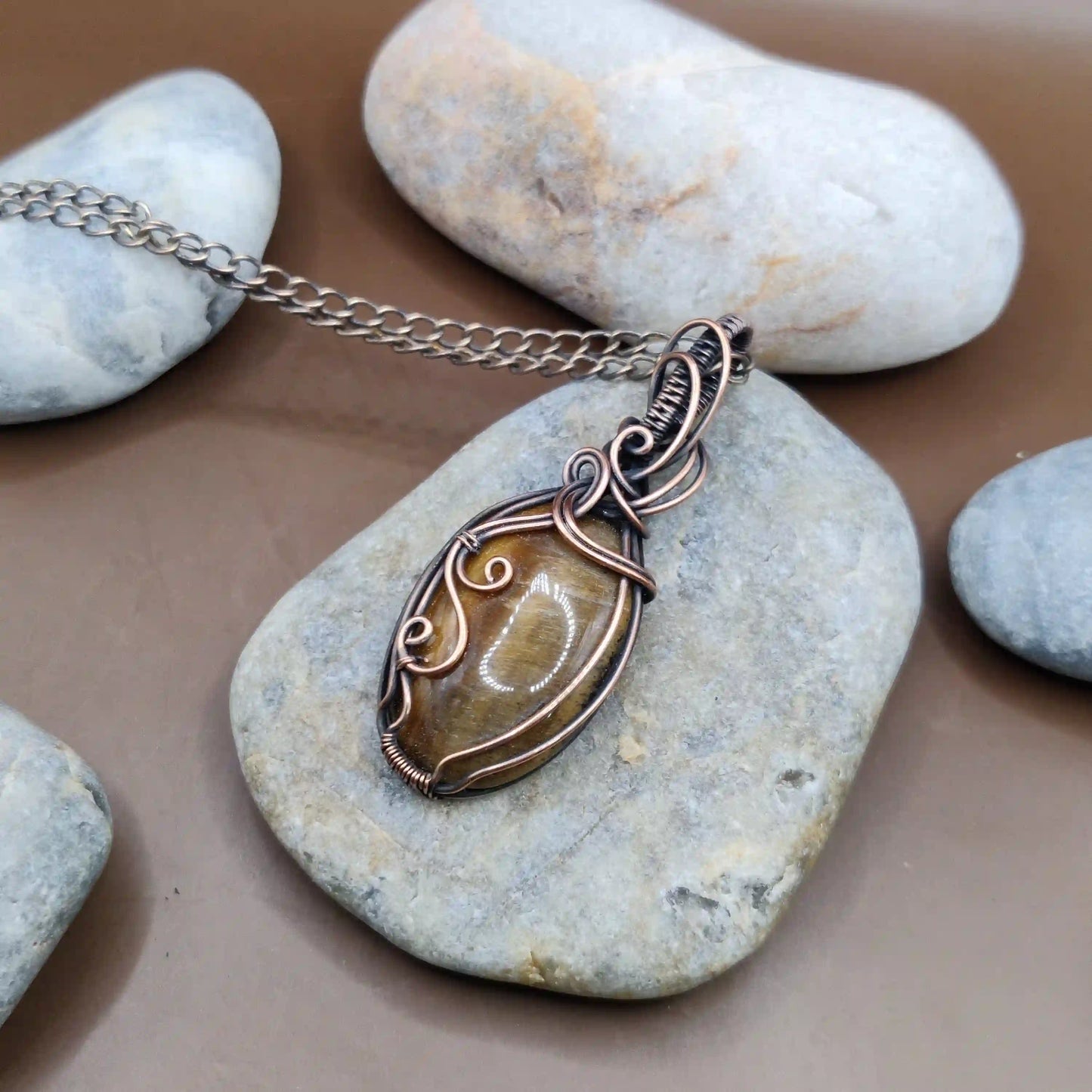 A tiger's eye gemstone, with its mesmerizing golden hues and a hint of mystery, is securely wrapped in antiqued copper wire. The oxidized finish lends a touch of sophistication, making this necklace an earthy and elegant statement piece. The pendant is accompanied with a matching chain of 18-24 inches.