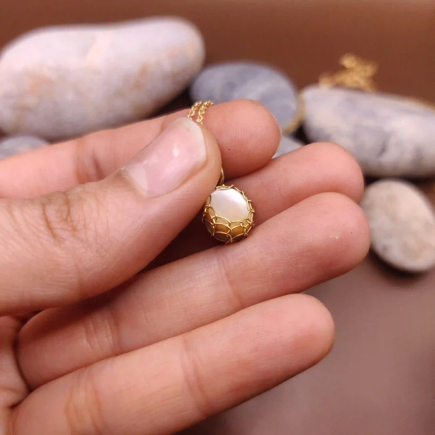 Embrace the harmonious energies of mother of pearl and brass with this exquisite necklace, and let it guide you towards a more balanced, peaceful, and insightful life.