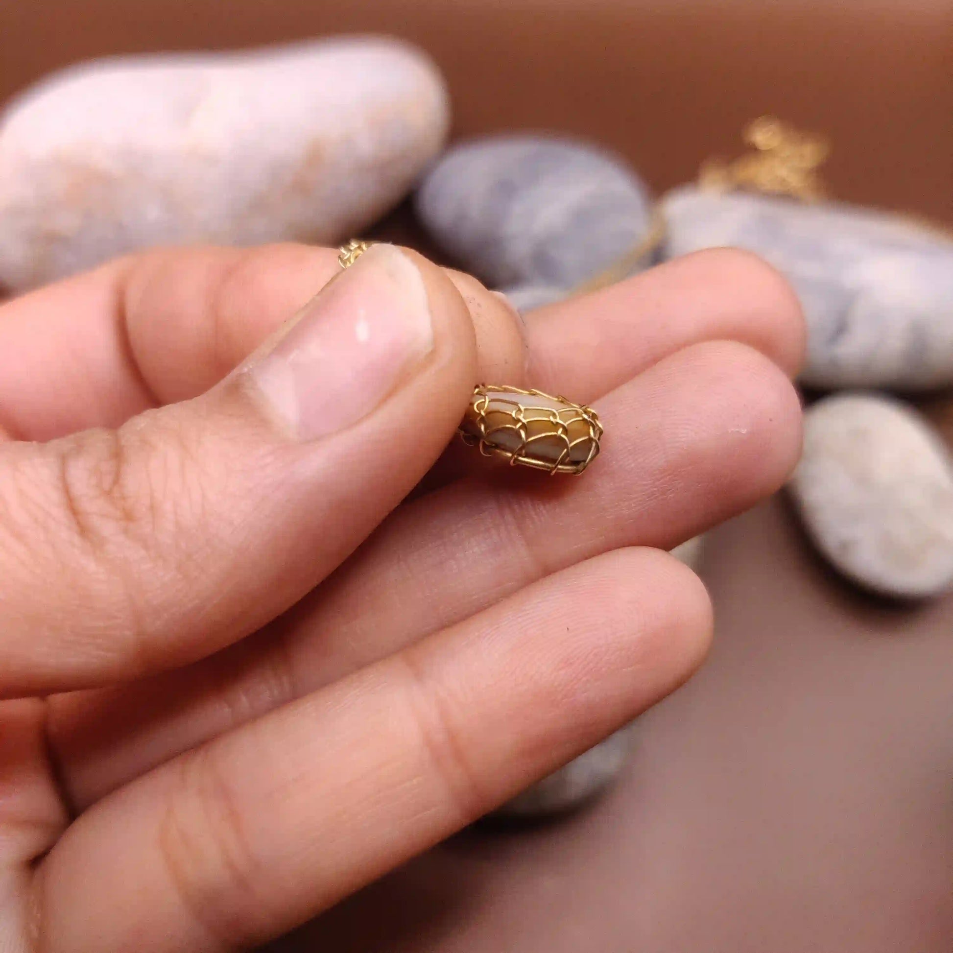 • Handmade with a natural mother of pearl cabochon and brass wire