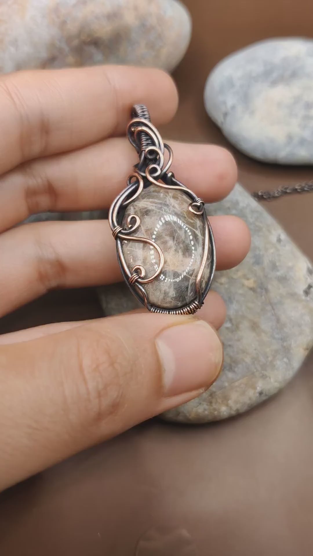 • Handmade with a natural black peach moonstone pendant and copper wire