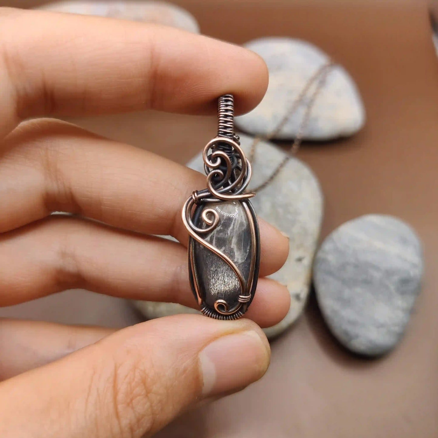 • Handmade with a natural black peach moonstone pendant and copper wire