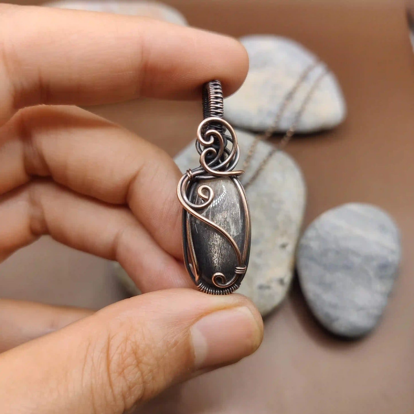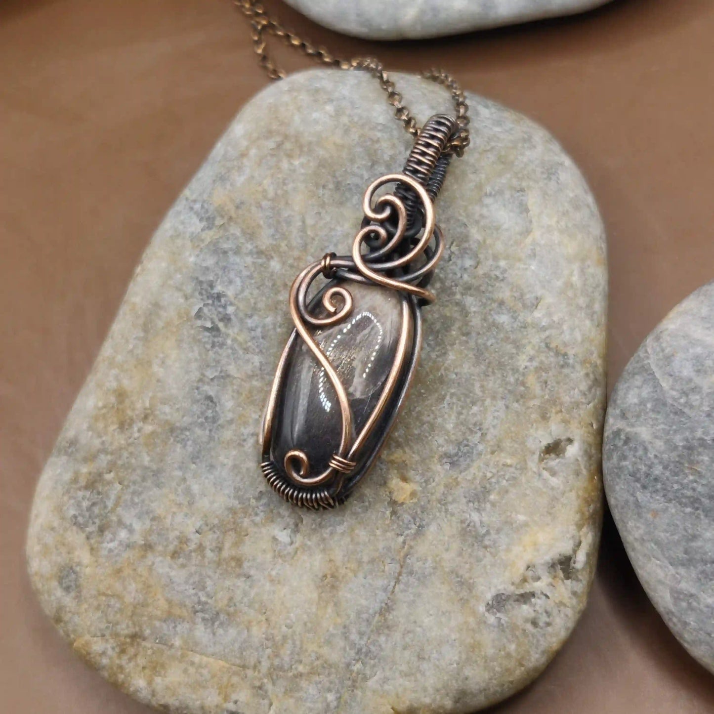 Embrace the moon's mysterious glow with this black moonstone necklace. Wrapped in oxidized copper wire, it combines the stone's intuition-boosting properties with copper's ability to clear negativity. This necklace empowers you to navigate life's uncertainties with clarity and grace.