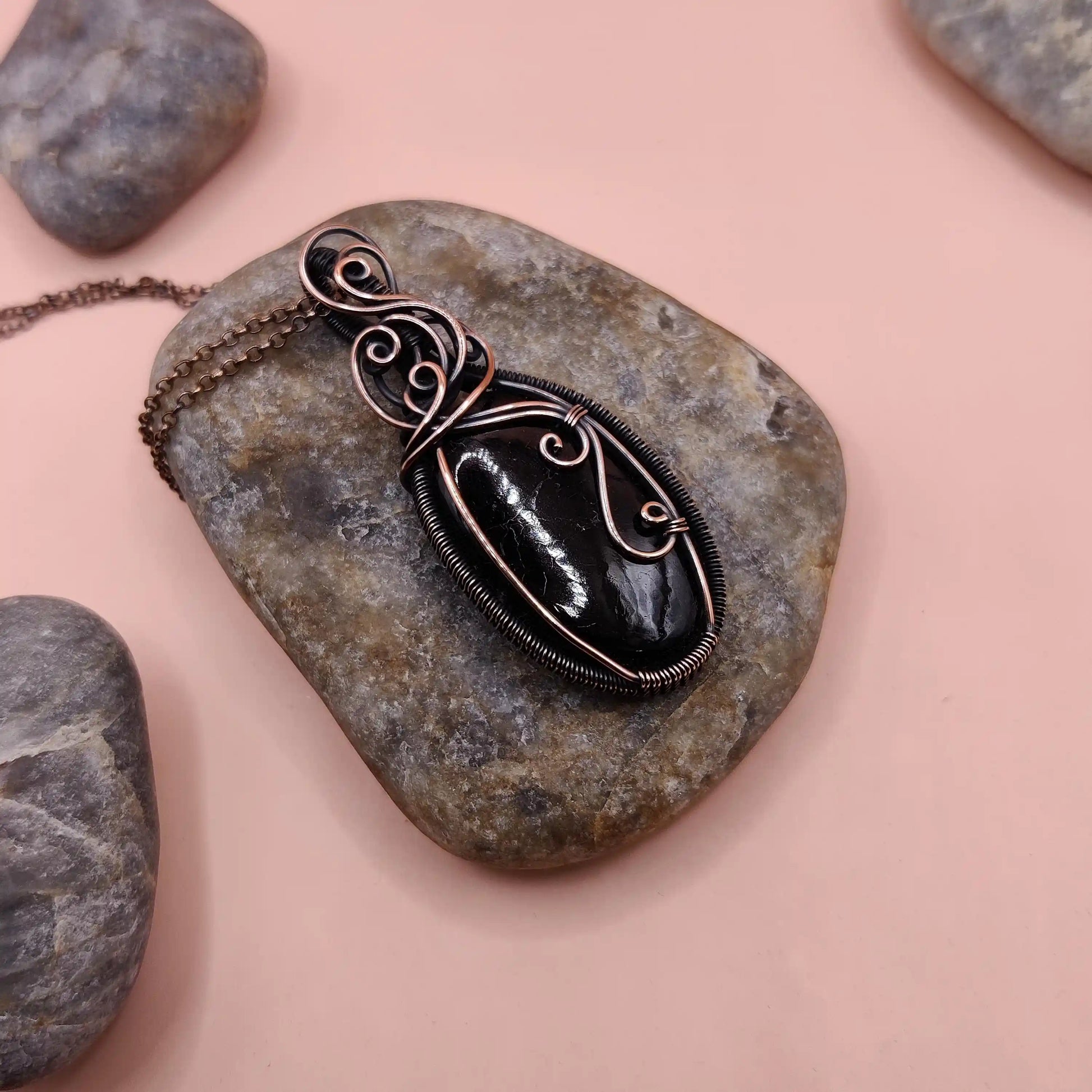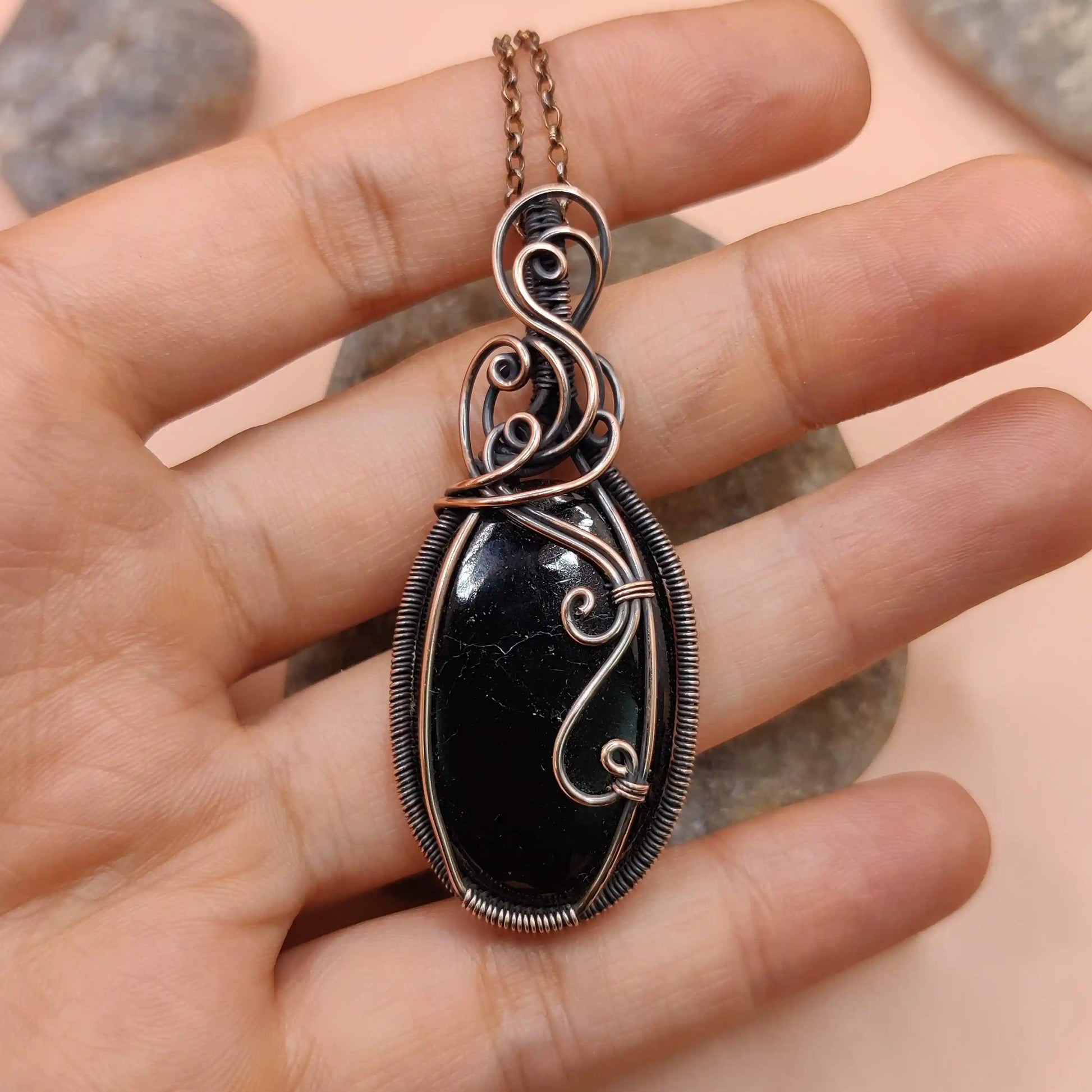 This necklace features a natural black tourmaline pendant wrapped in oxidized copper, with intricate wirework that emphasizes the stone’s raw beauty. Paired with a matching copper chain, this design offers a bold yet elegant look.