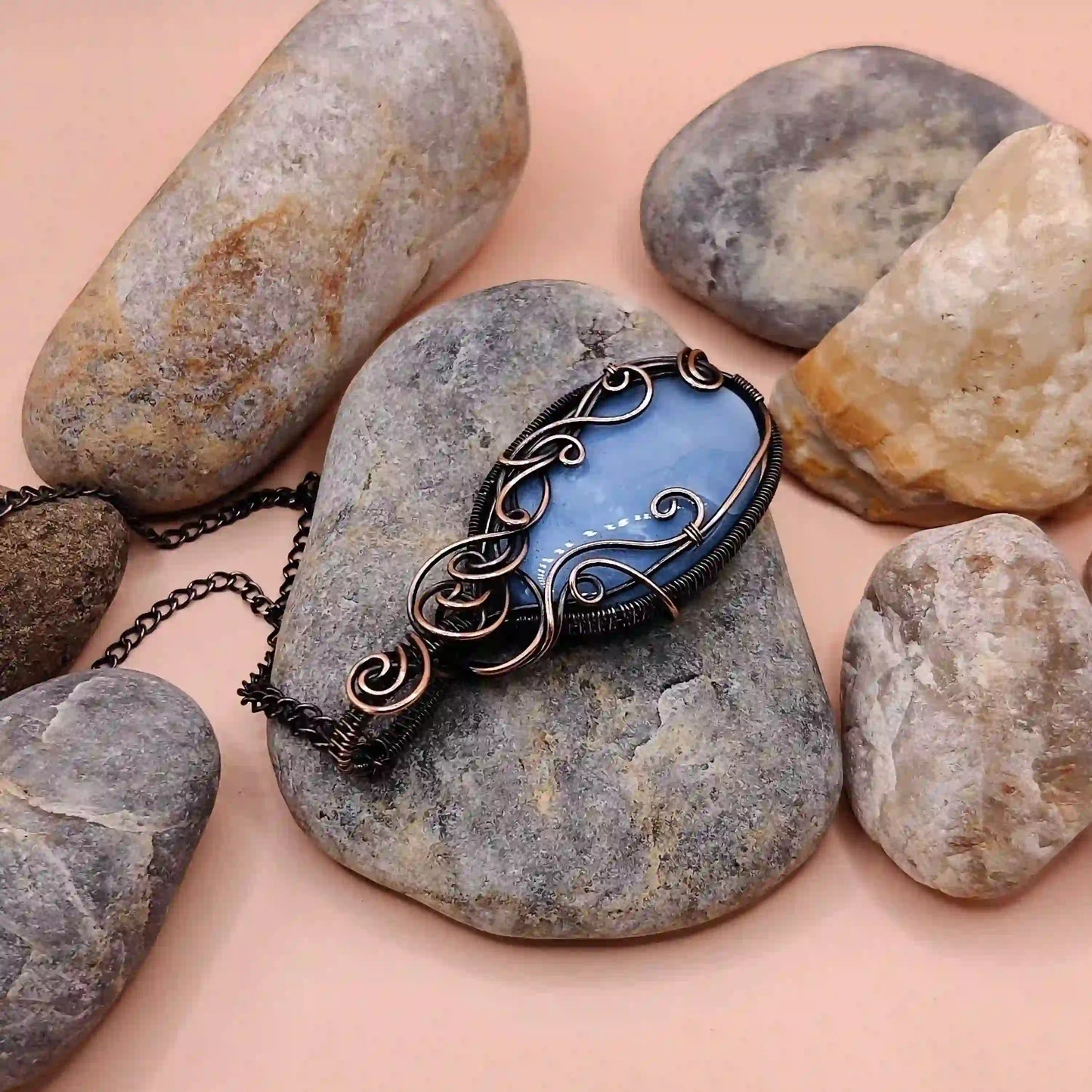 • Handmade with a natural Owyhee Blue Opal stone and copper wire