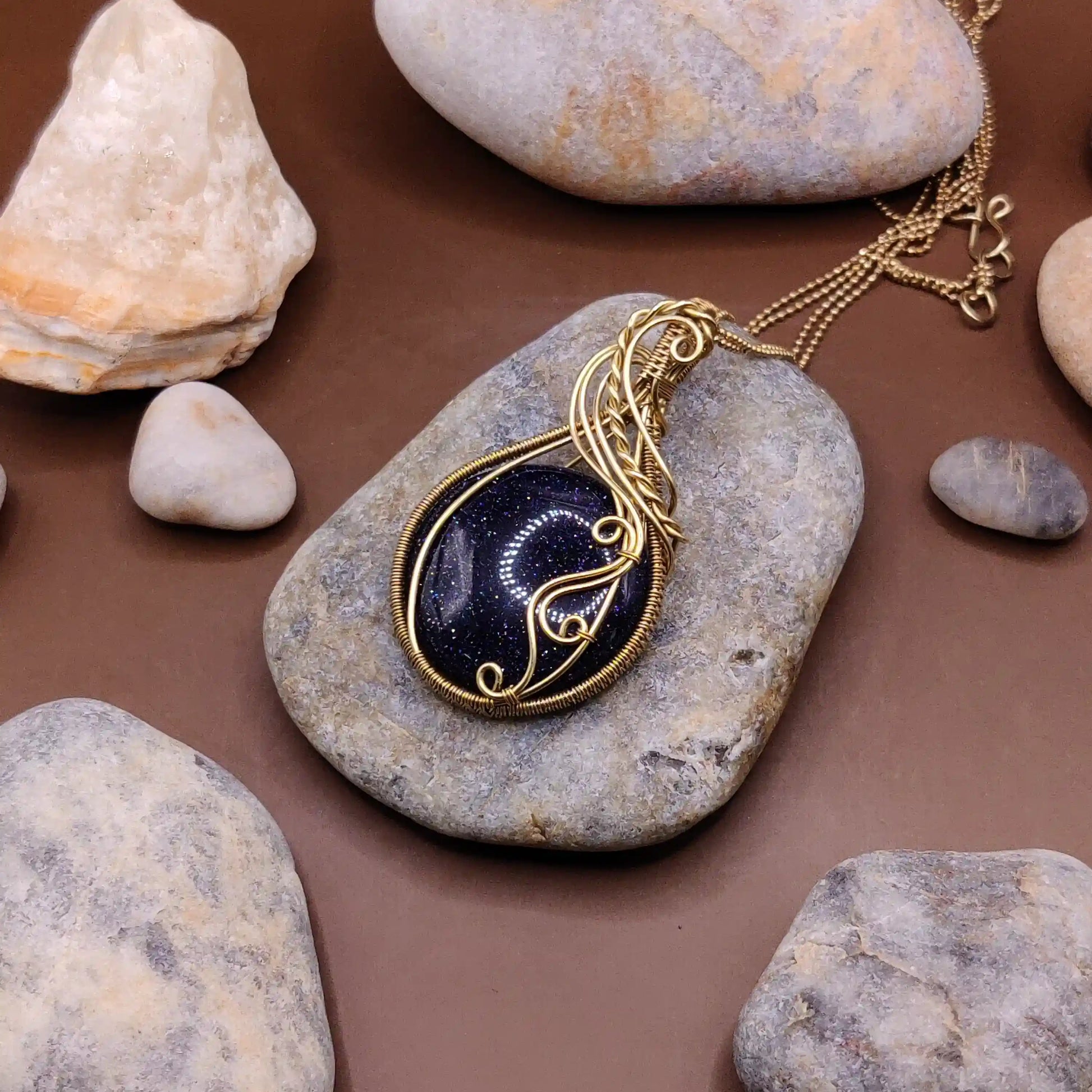 This enchanting handmade necklace features a deep midnight-blue Blue Sandstone pendant, elegantly set in brass and paired with a matching brass chain. Sparkling with countless copper flecks that resemble a starlit sky, this piece evokes the magic of the cosmos—symbolizing dreams, destiny, and limitless potential.