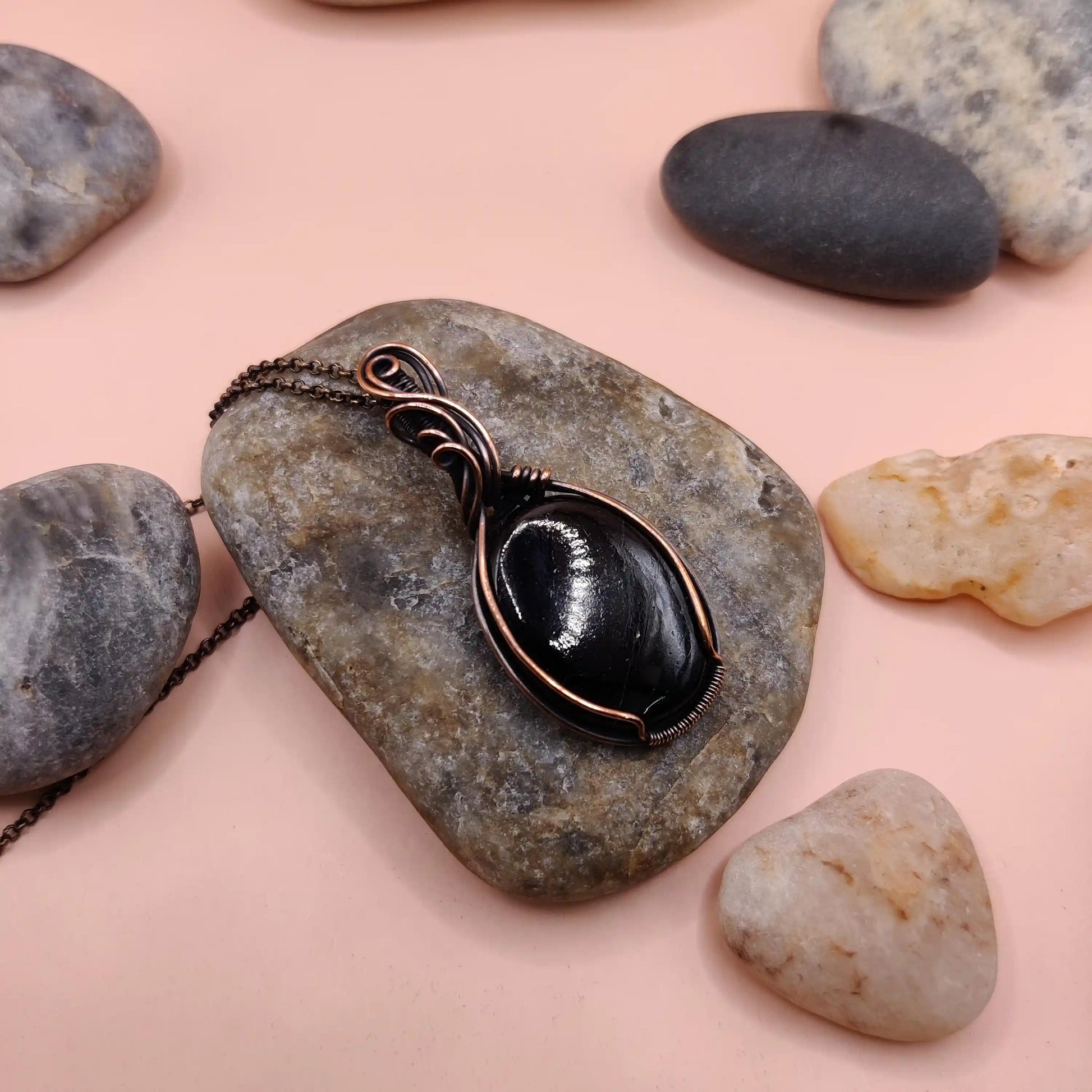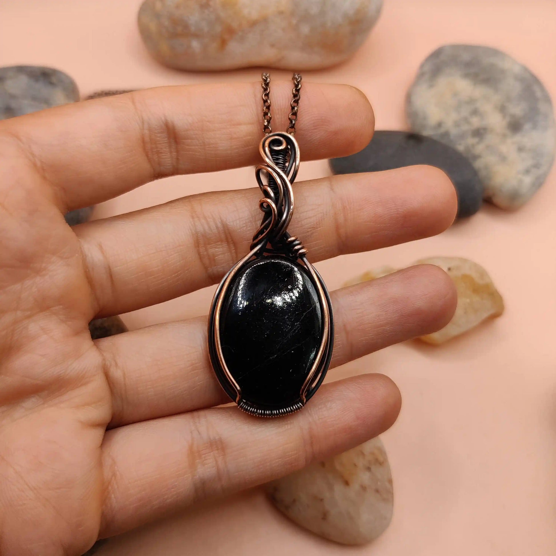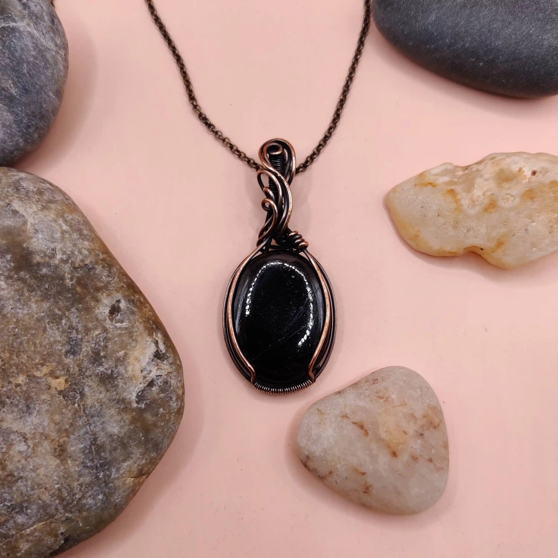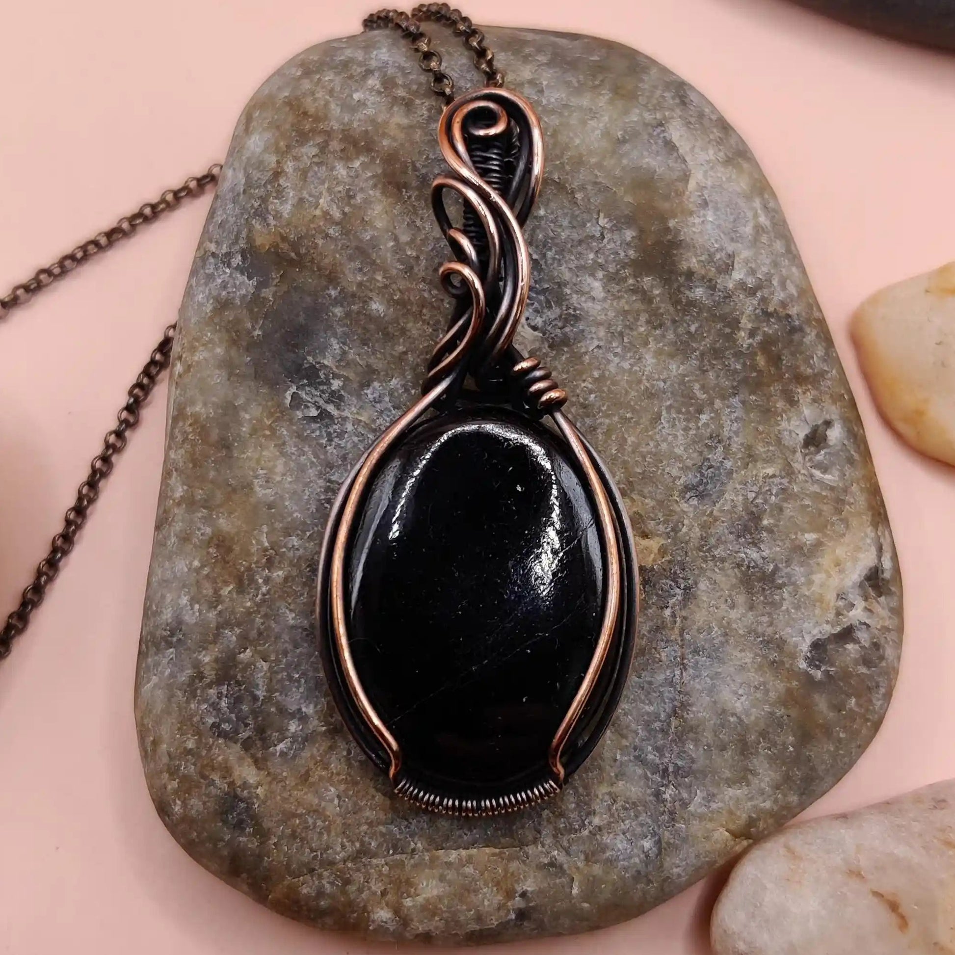 This necklace features a natural black tourmaline pendant wrapped in oxidized copper, with intricate wirework that emphasizes the stone’s raw beauty. Paired with a matching copper chain, this design offers a bold yet elegant look.