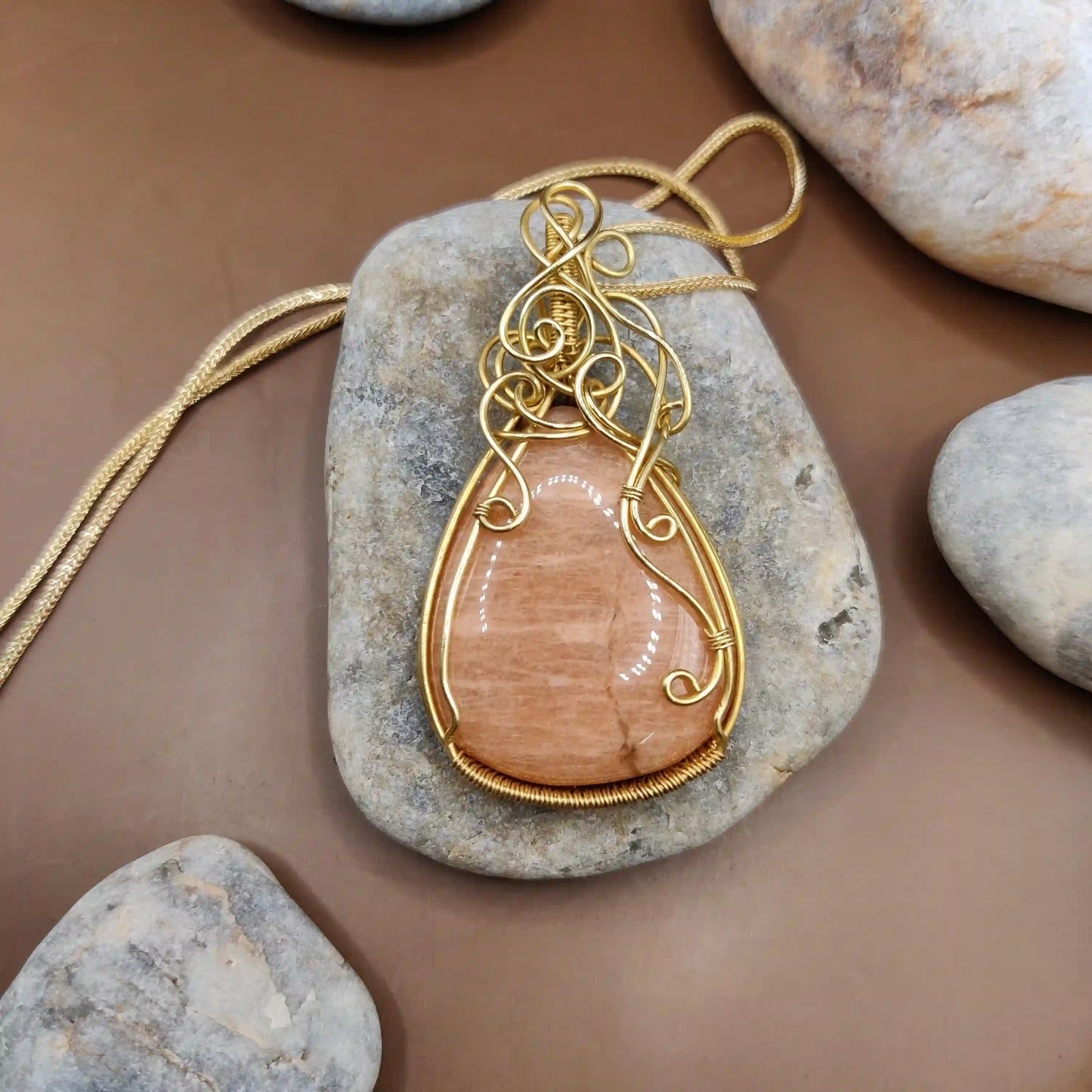 Find harmony and grace with this stunning necklace. A soft pink amazonite stone, known for its calming properties, is delicately wrapped in gleaming brass wire. The delicate design adds a touch of elegance to any outfit.