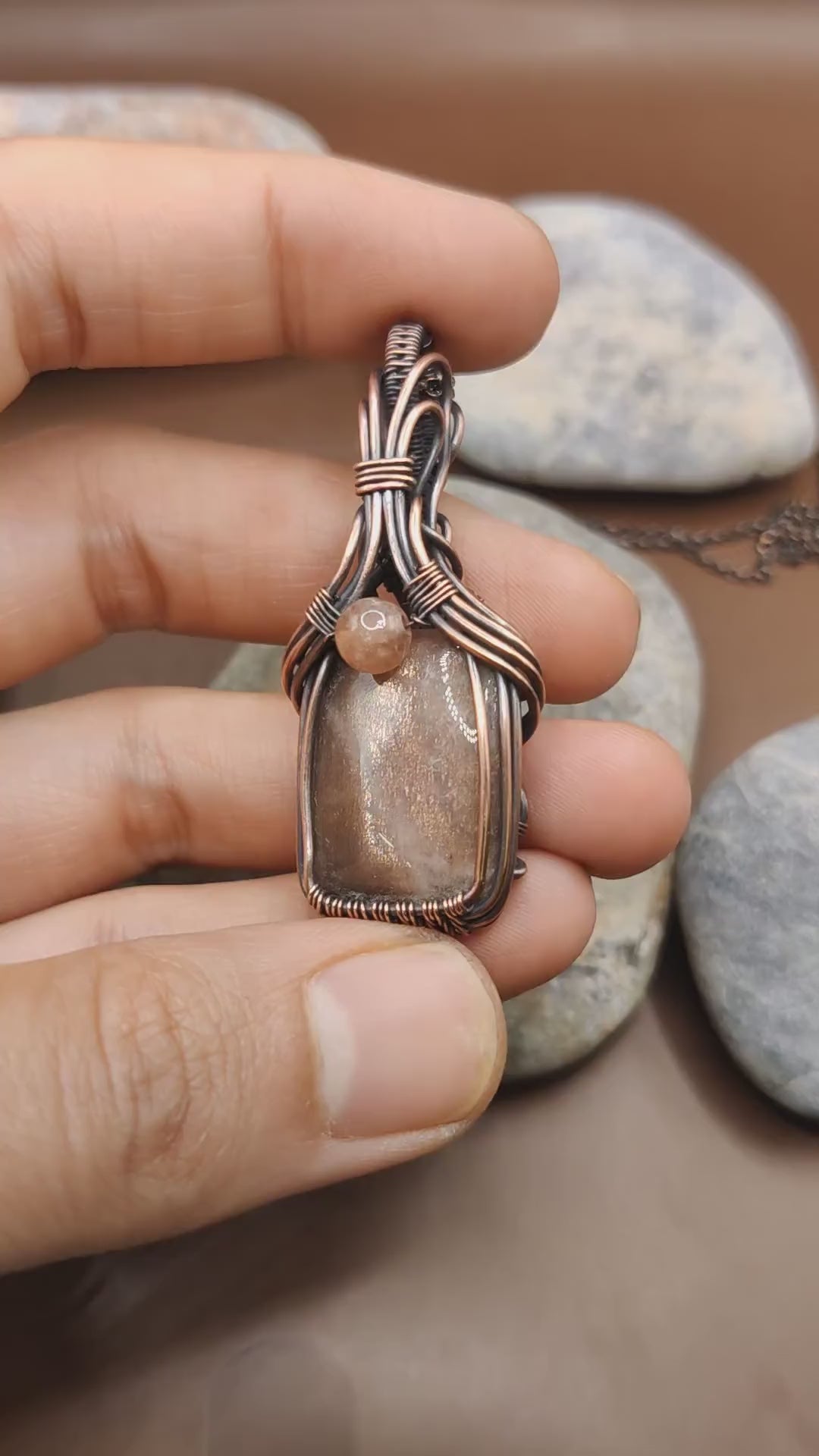 This necklace combines the captivating beauty of Black Moonstone and Sunstone, wrapped in the earthy tones of oxidized copper wire. It is believed to offer a range of potential benefits for the wearer, promoting emotional balance, positivity, and personal growth.