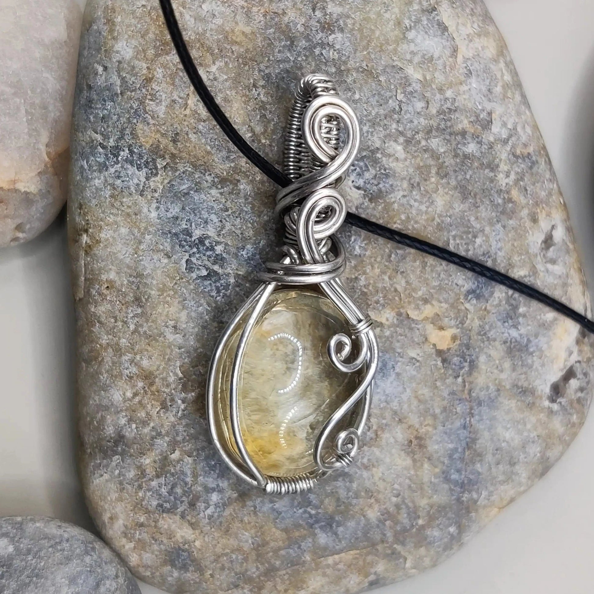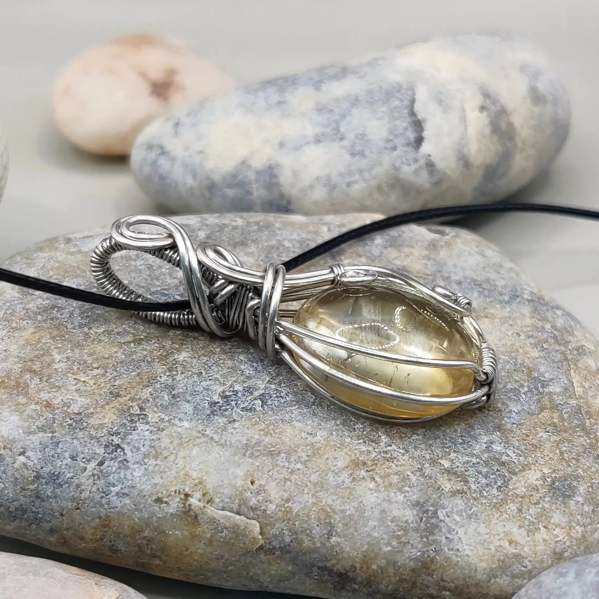 This bright necklace features a sparkling citrine stone, known to attract abundance and positive energy. Wrapped in delicate silver wire, it brings a touch of sunshine and optimism to your day. Perfect for attracting success and keeping your spirits high.