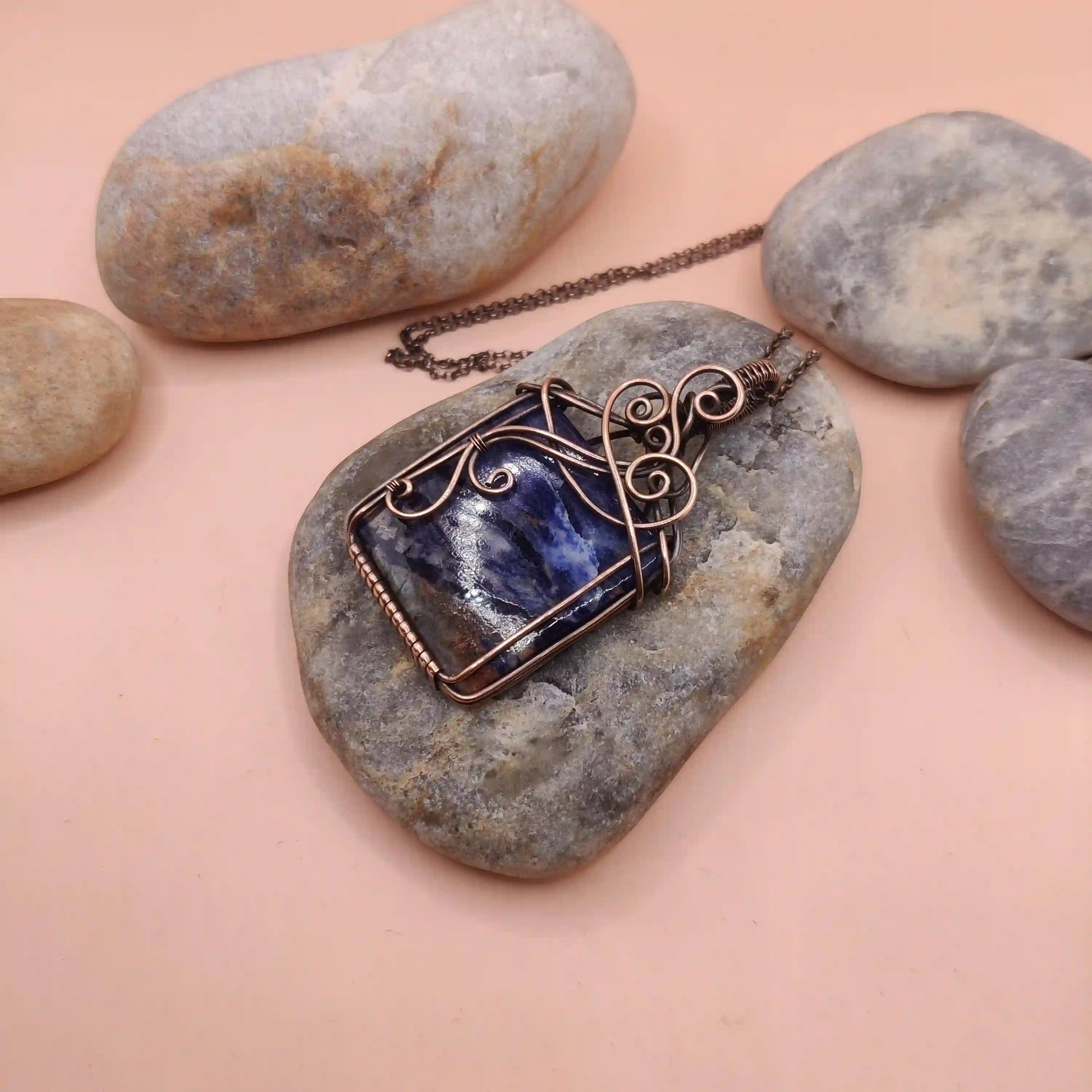The necklace features a stunning sodalite stone, complemented by a matching copper chain. This fixed-length chain is designed to showcase the stone beautifully, ensuring a cohesive and elegant look.