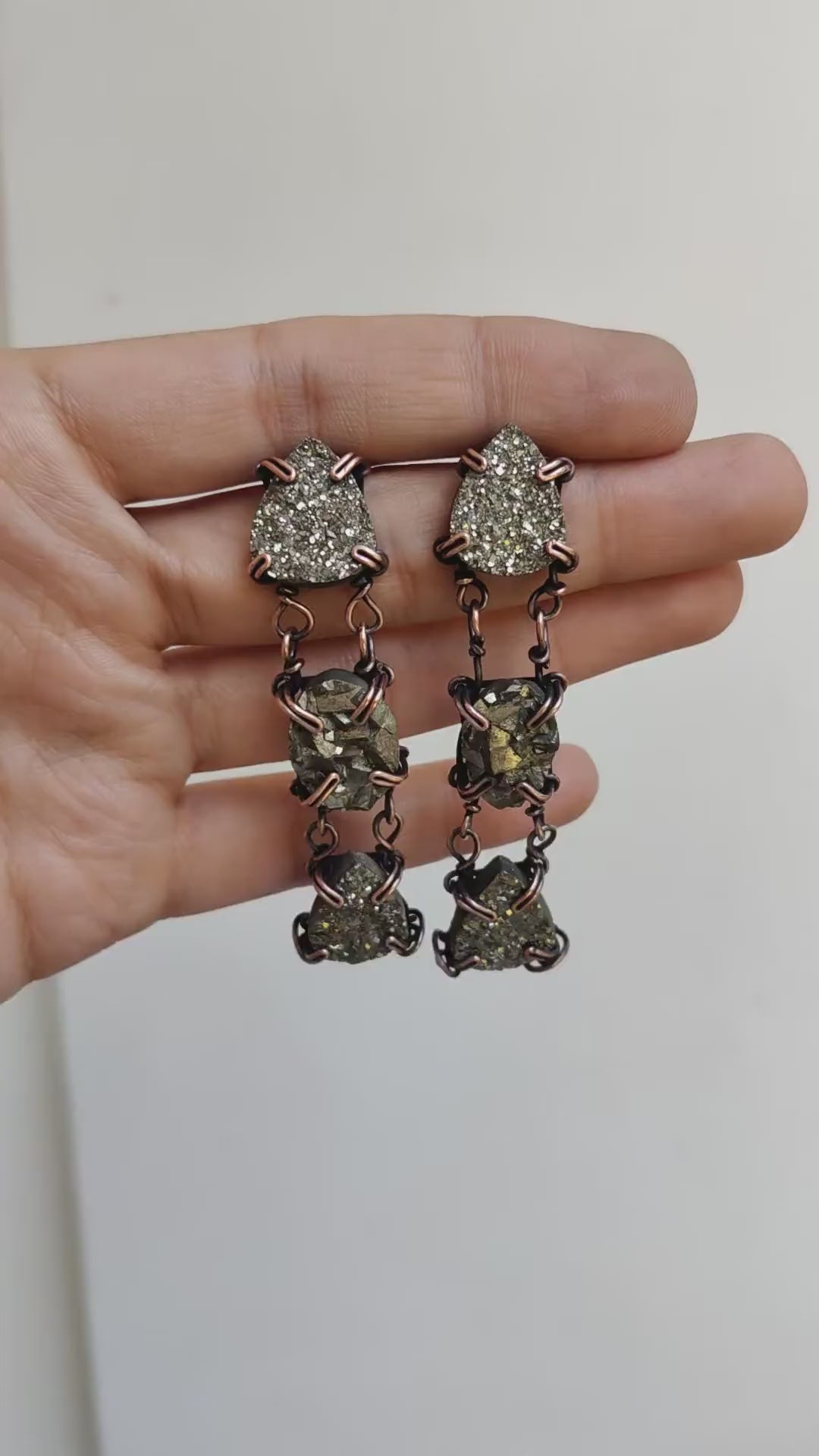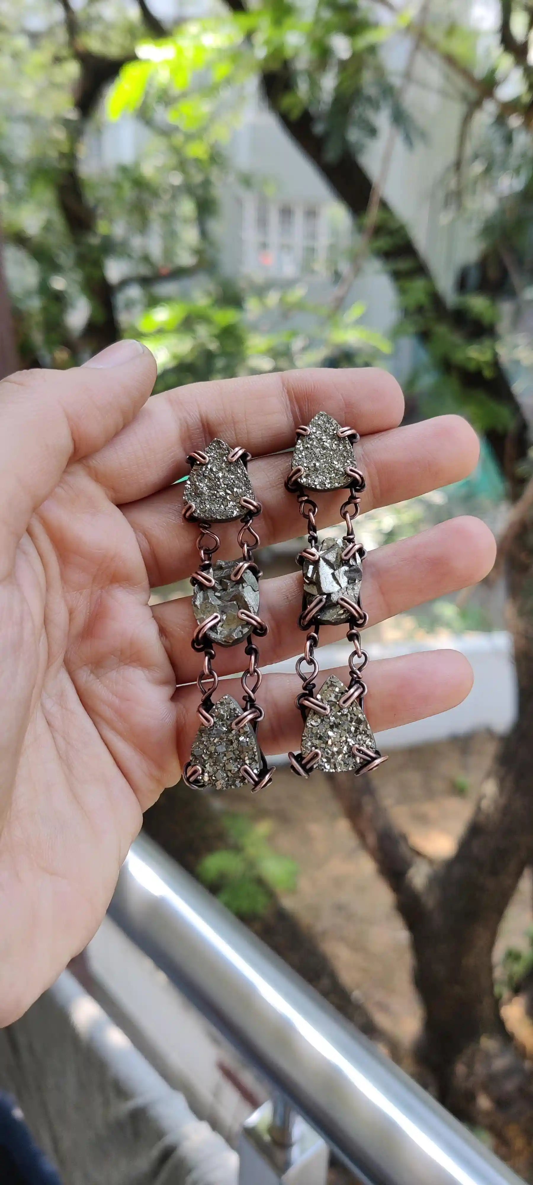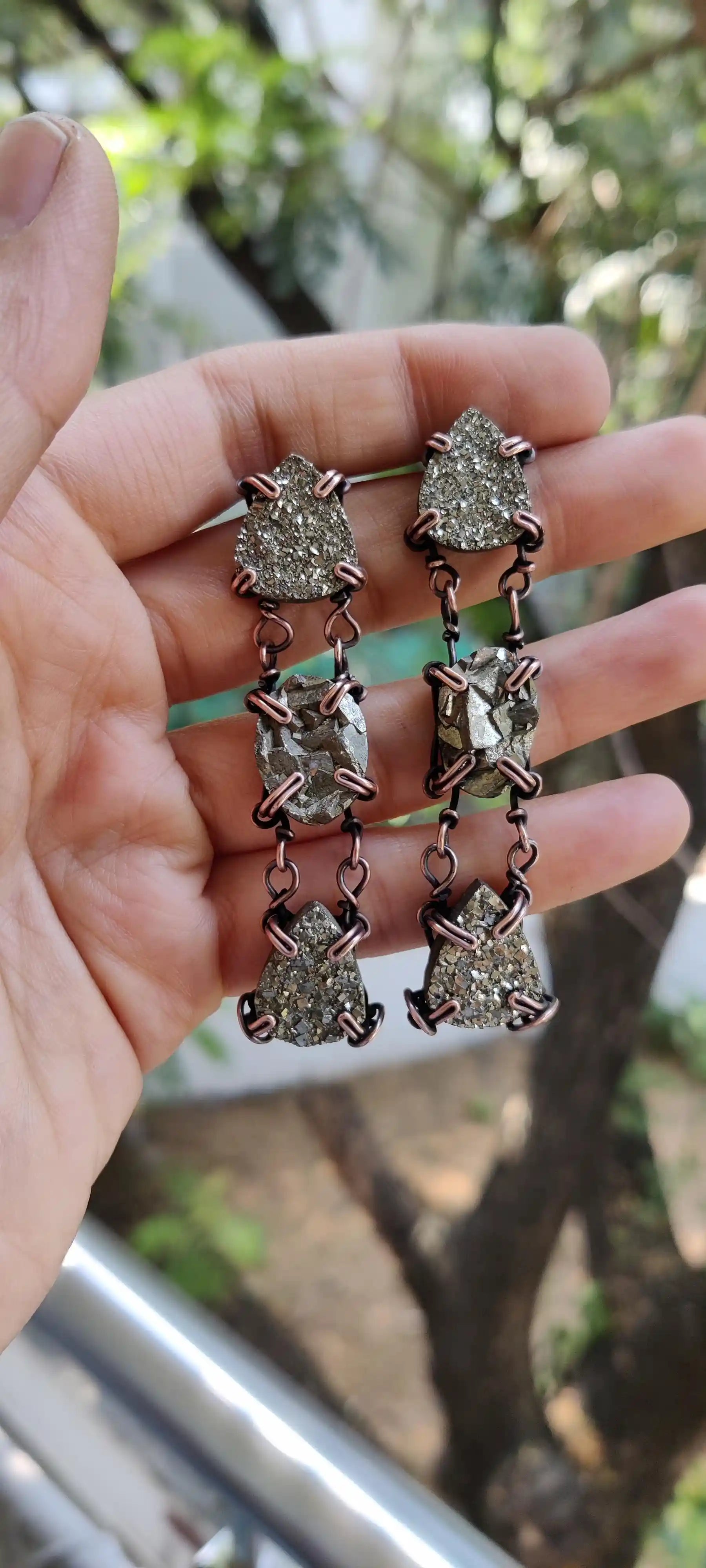 Adorn yourself with the earthy brilliance of Pyrite, beautifully handcrafted into these statement oxidized copper earrings. Each earring features three hand-selected raw pyrite cabochons, meticulously set in pure copper and oxidized to enhance their natural, rugged charm. The deep, antique patina of the copper perfectly complements the metallic gleam of pyrite, creating a piece that is both grounding and empowering.