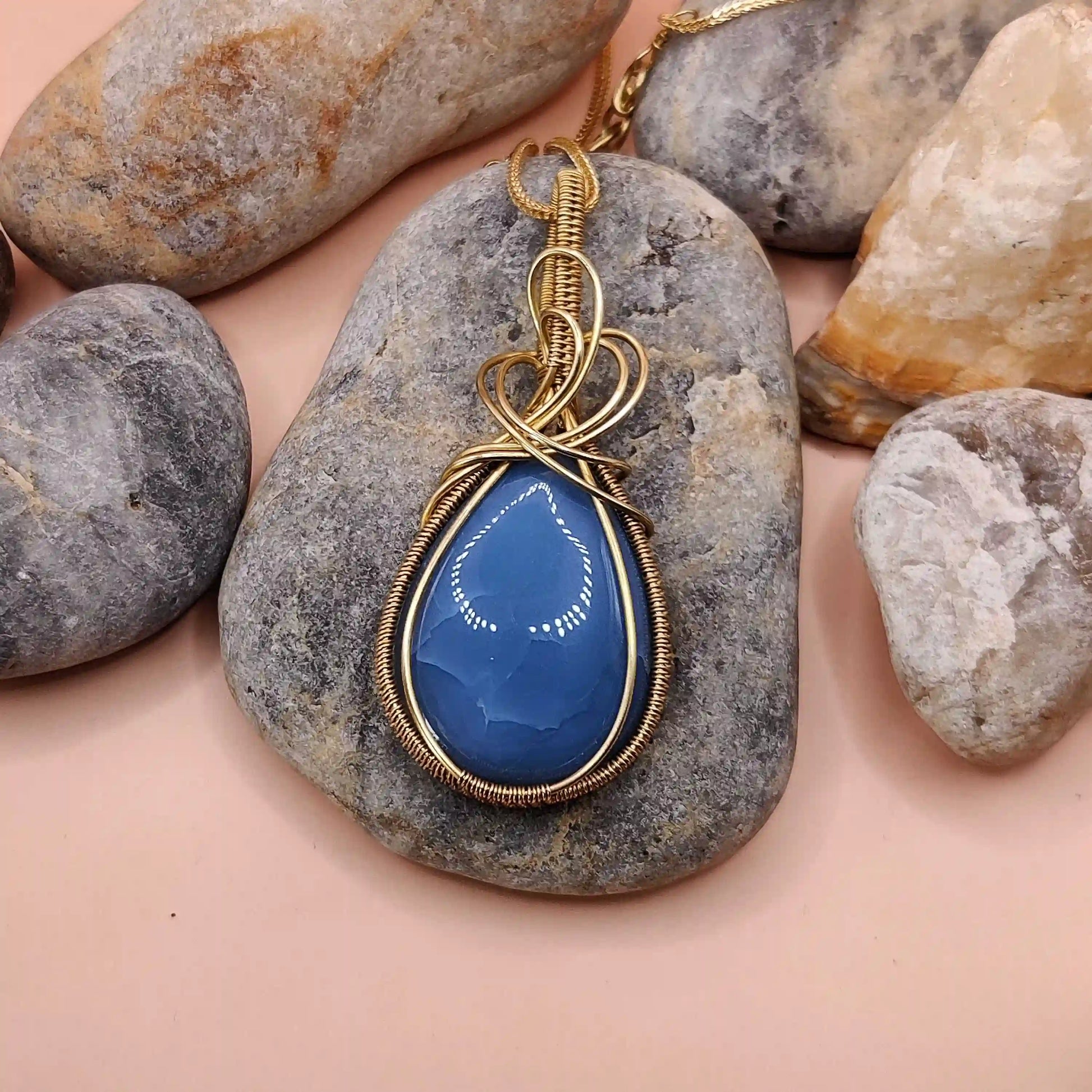 The necklace features a stunning Owyhee Blue Opal stone, elegantly wrapped in brass wire. This fixed-length chain is designed to showcase the pendant beautifully, ensuring a cohesive and elegant look.
