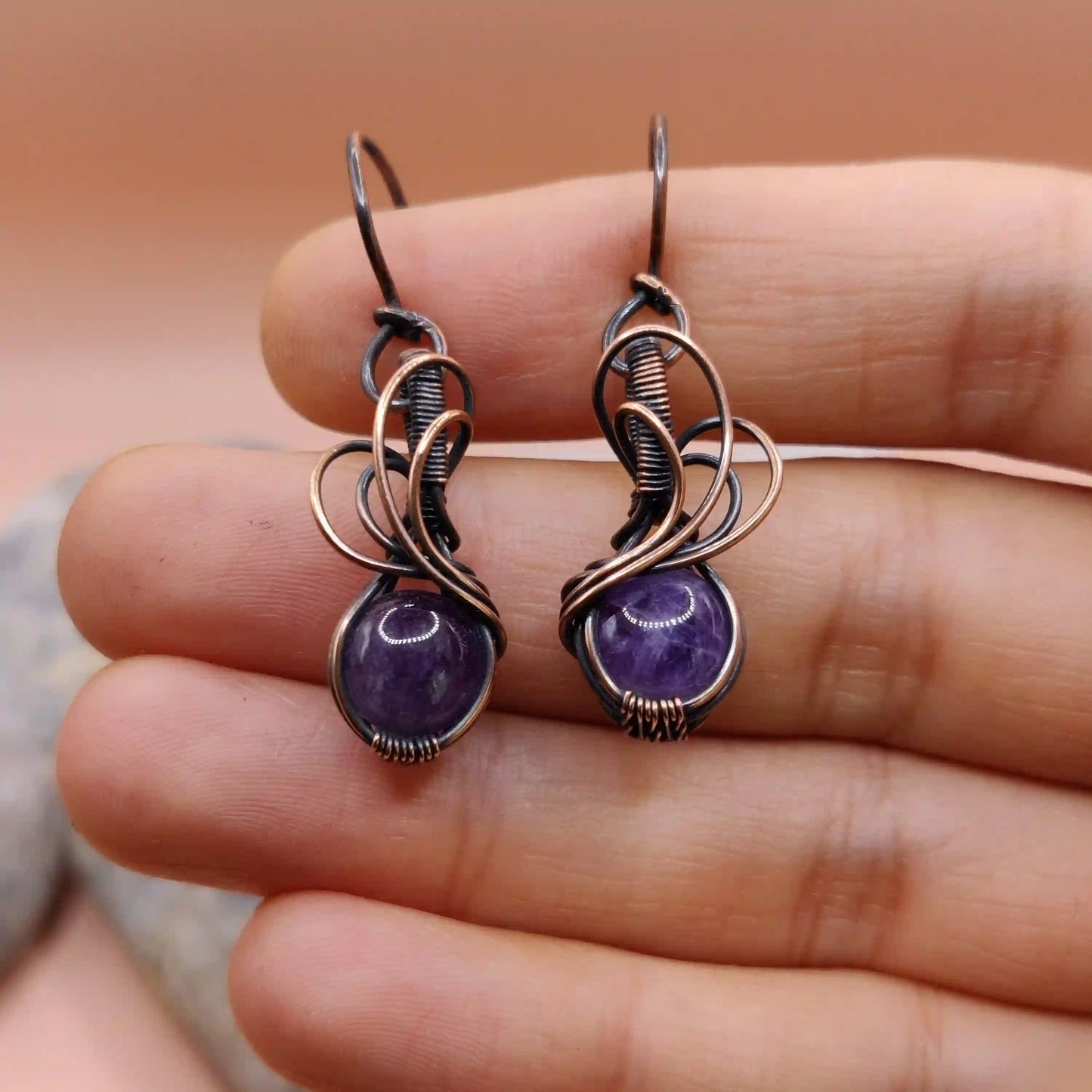 The earrings feature stunning amethyst stones complemented by intricate copper wirework. This combination ensures a cohesive and elegant look, perfect for any occasion.