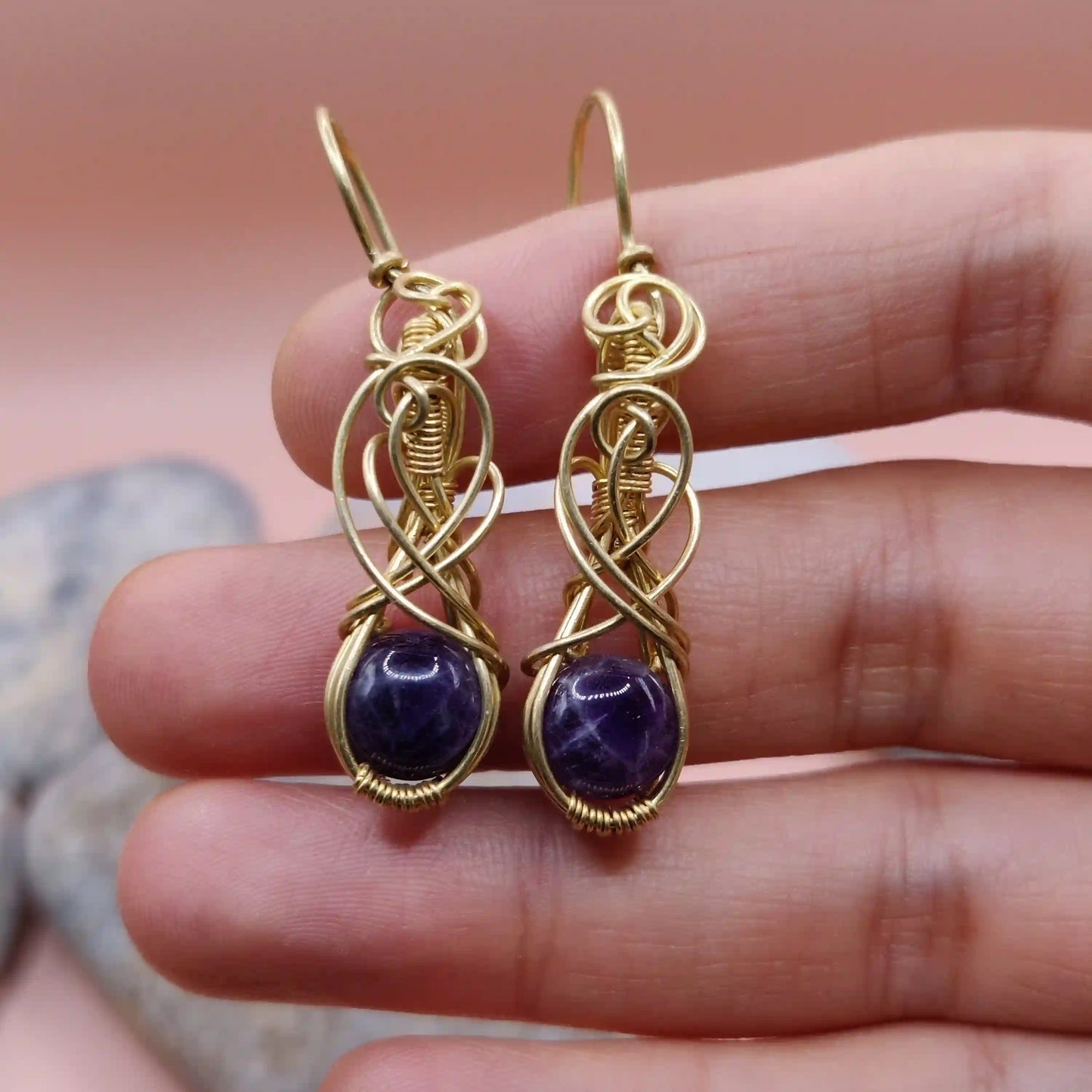 The earrings feature stunning amethyst stones set in intricate brass wirework. This combination ensures a cohesive and elegant look, perfect for any occasion.