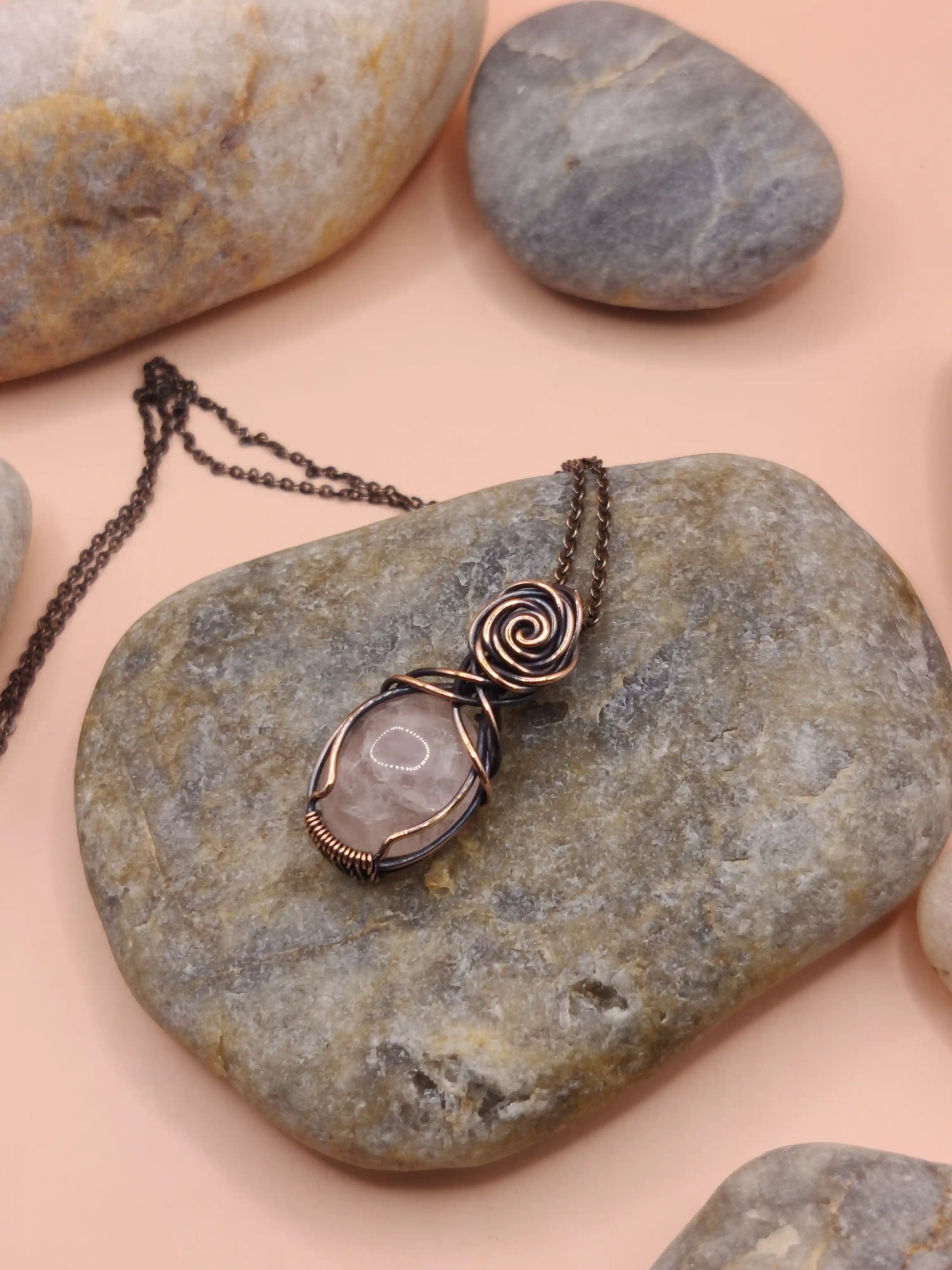 The dark patina of oxidized copper not only adds a vintage charm to this necklace but also enhances the natural frequency of rose quartz. Copper is known to be a powerful conductor of energy—both physical and spiritual.