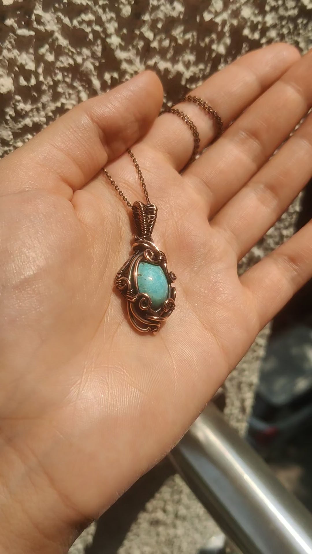Step into the serene energy of the Irani Firoza (Natural Turquoise) with this intricately handcrafted pendant, wrapped in fine oxidized copper wirework. Firoza, one of the most ancient and cherished gemstones in human history, is celebrated across cultures as a stone of wisdom, protection, and tranquility. Revered by kings, warriors, travelers, and spiritual seekers, this calming blue-green stone has adorned sacred jewelry for millennia as a powerful talisman of good fortune and peace.