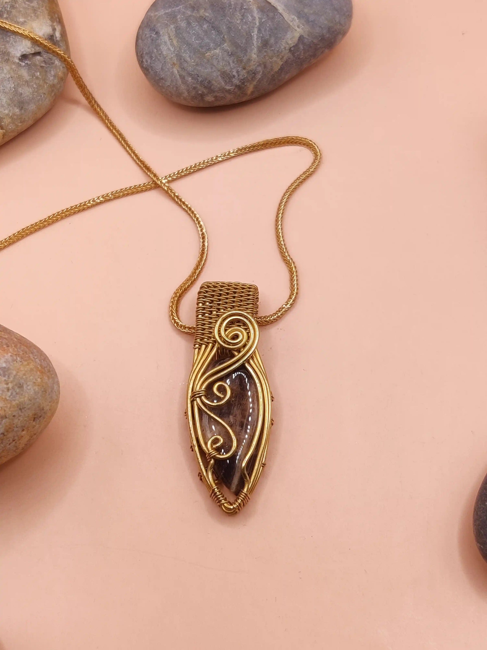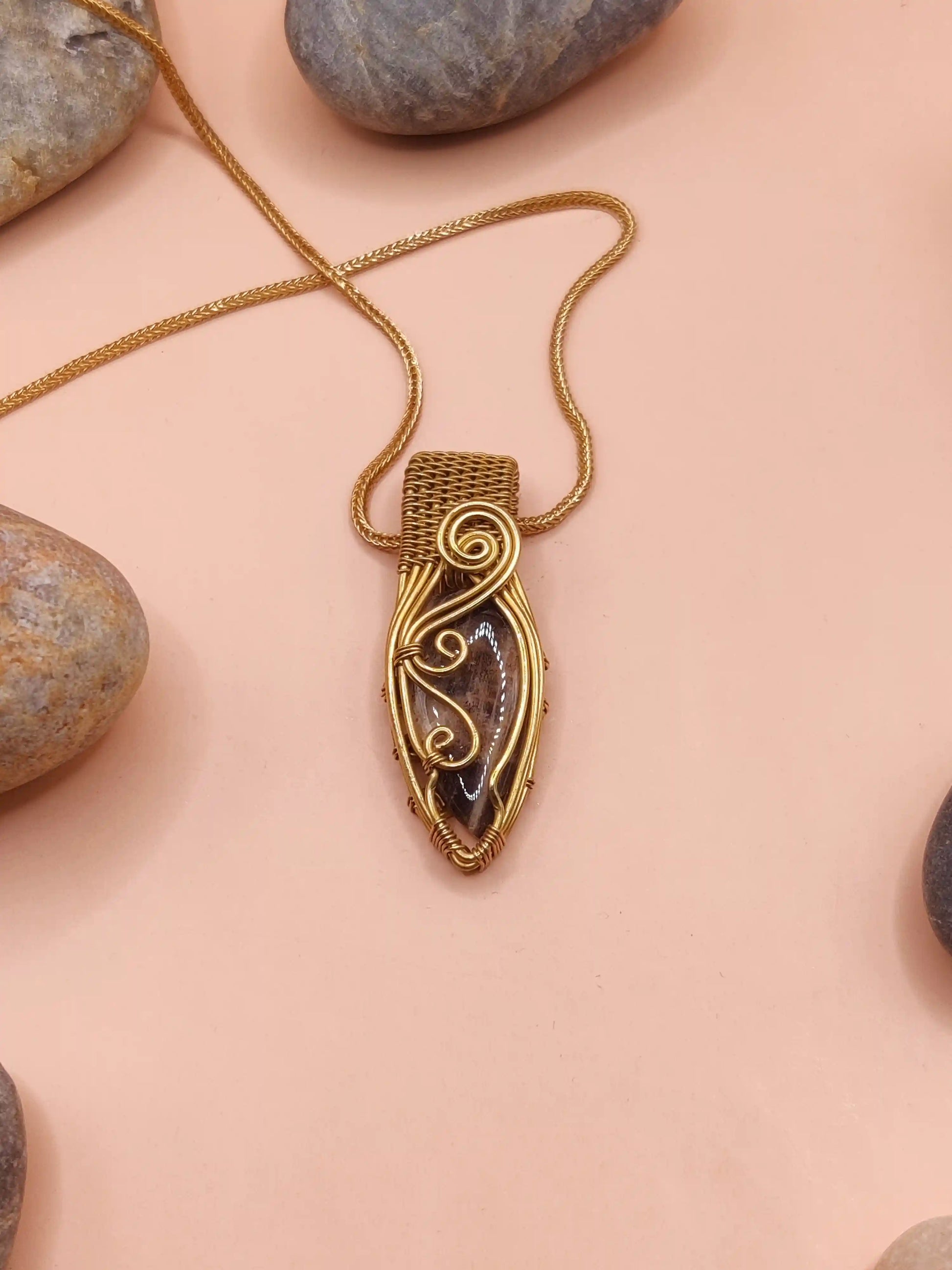 This handcrafted necklace features a stunning Black Peach Moonstone, its gentle shimmer dancing with shades of bronze, peach, and deep charcoal. Set in a warm brass frame and paired with a matching brass chain, the pendant celebrates the quiet strength and inner glow of the divine feminine. Each stone is unique, showing natural patterns and soft flashes that make this piece both mystical and elegant.