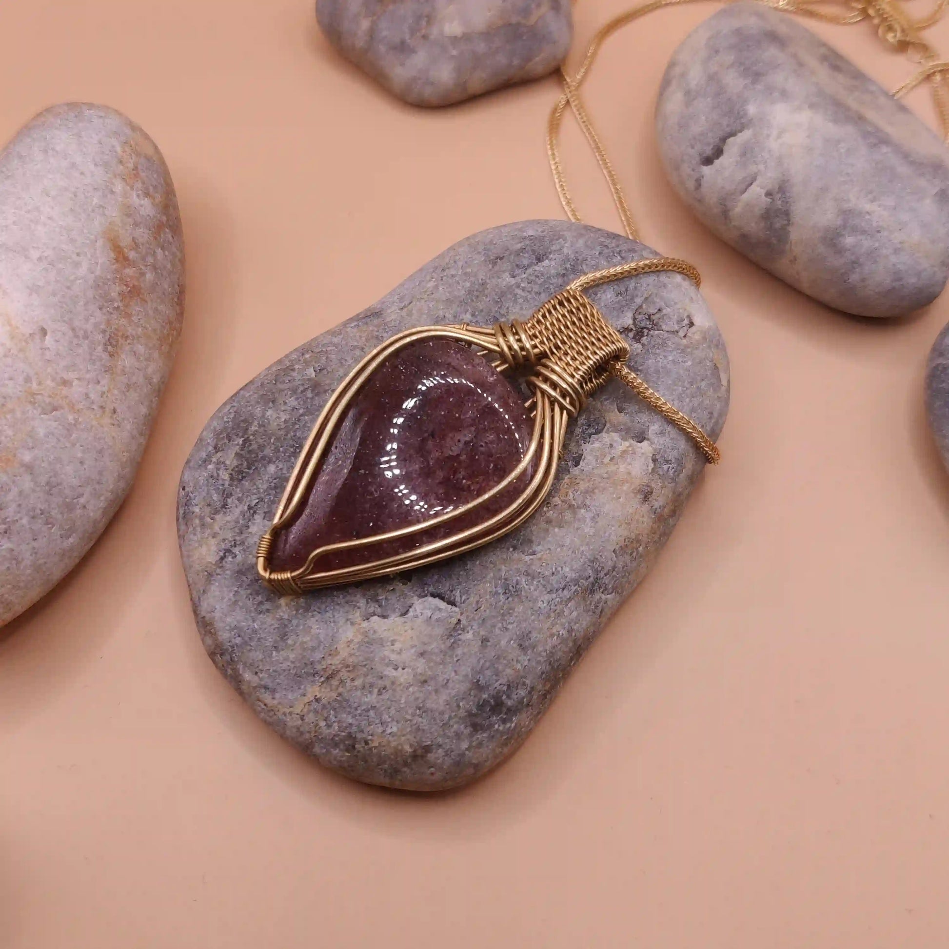 • Handmade with a natural strawberry quartz pendant and brass wire wrapping