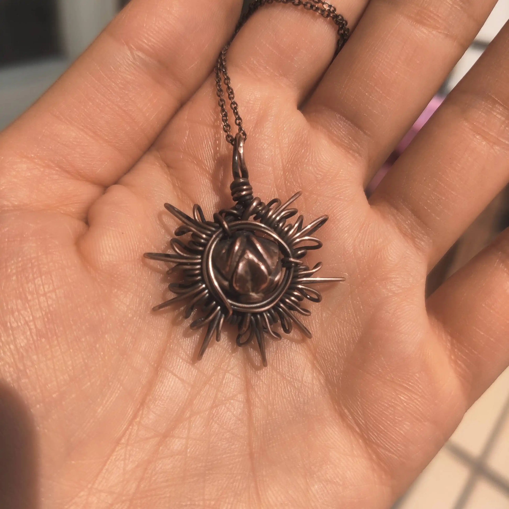 Channel the warmth and energy of the sun with this exquisitely handcrafted oxidized pure copper necklace, featuring a pendant inspired by the radiant beauty of a blooming flower or the sun’s glowing rays. Designed with intricate copper wirework and a central copper bead, this piece embodies both strength and elegance. The deep patina of oxidized copper enhances its vintage charm, making it a truly timeless and meaningful accessory.
