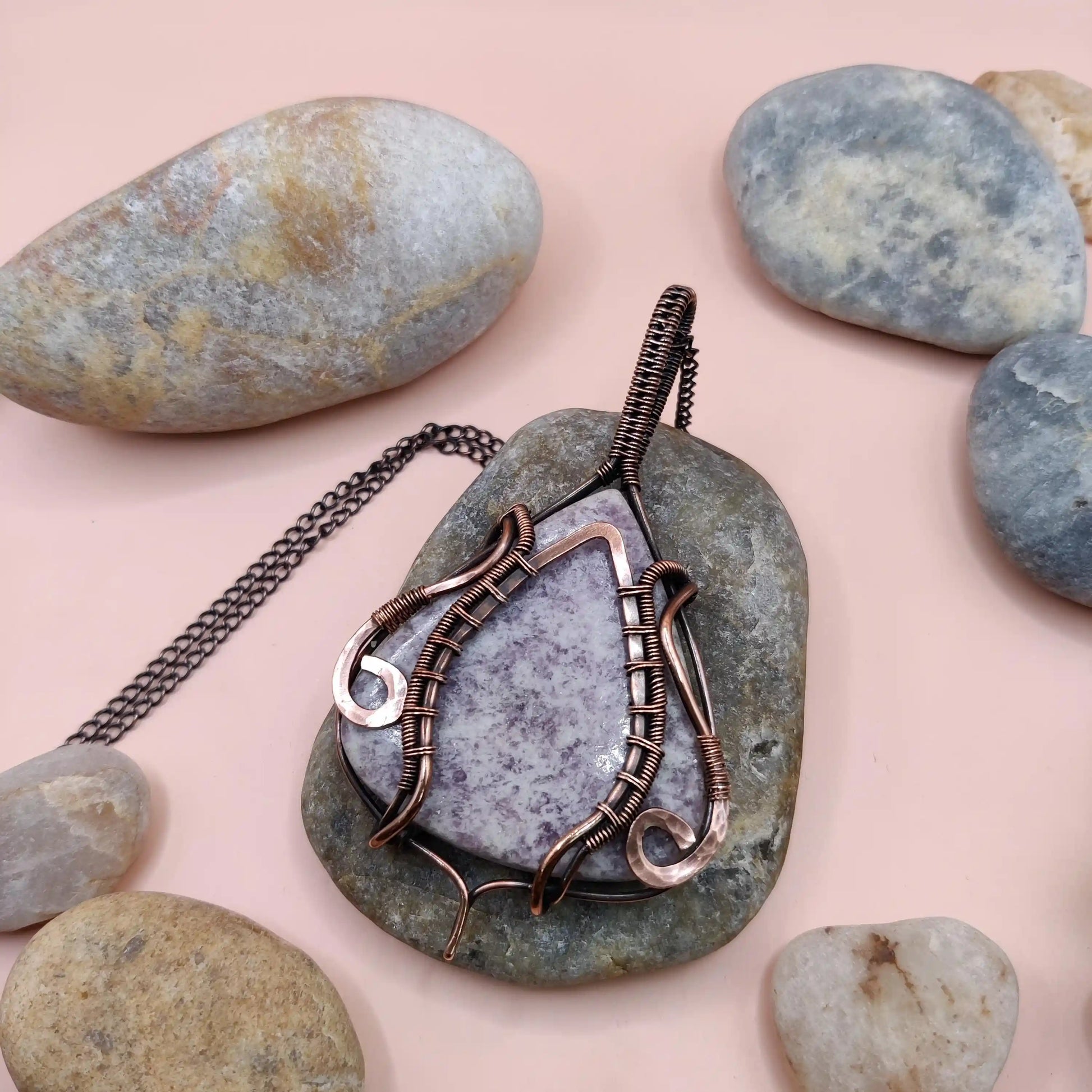 This necklace features a natural lepidolite pendant wrapped in oxidized copper, with intricate wirework that highlights the stone’s serene beauty. Paired with a matching copper chain, it is a timeless piece designed to promote peace and elegance.
