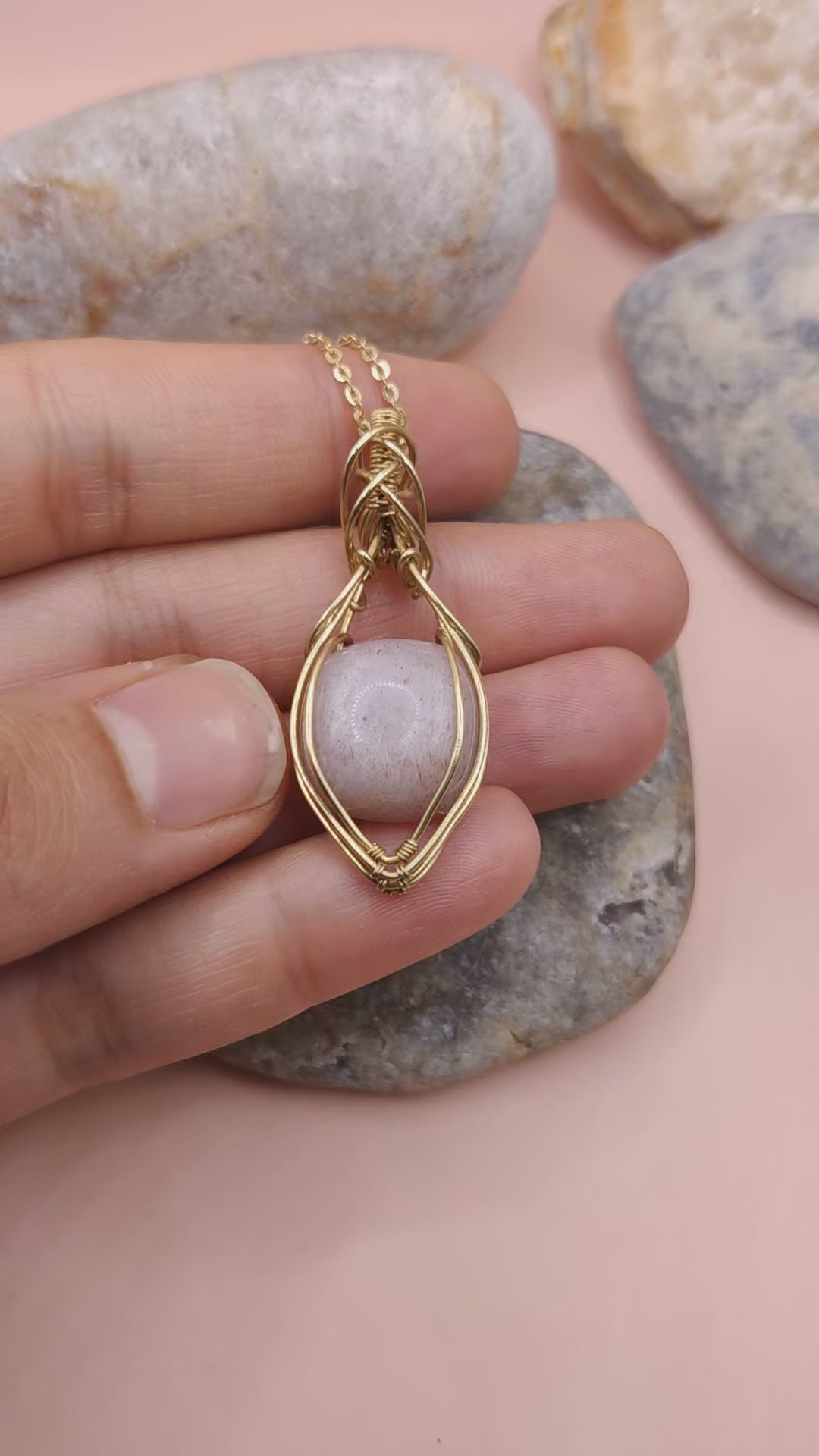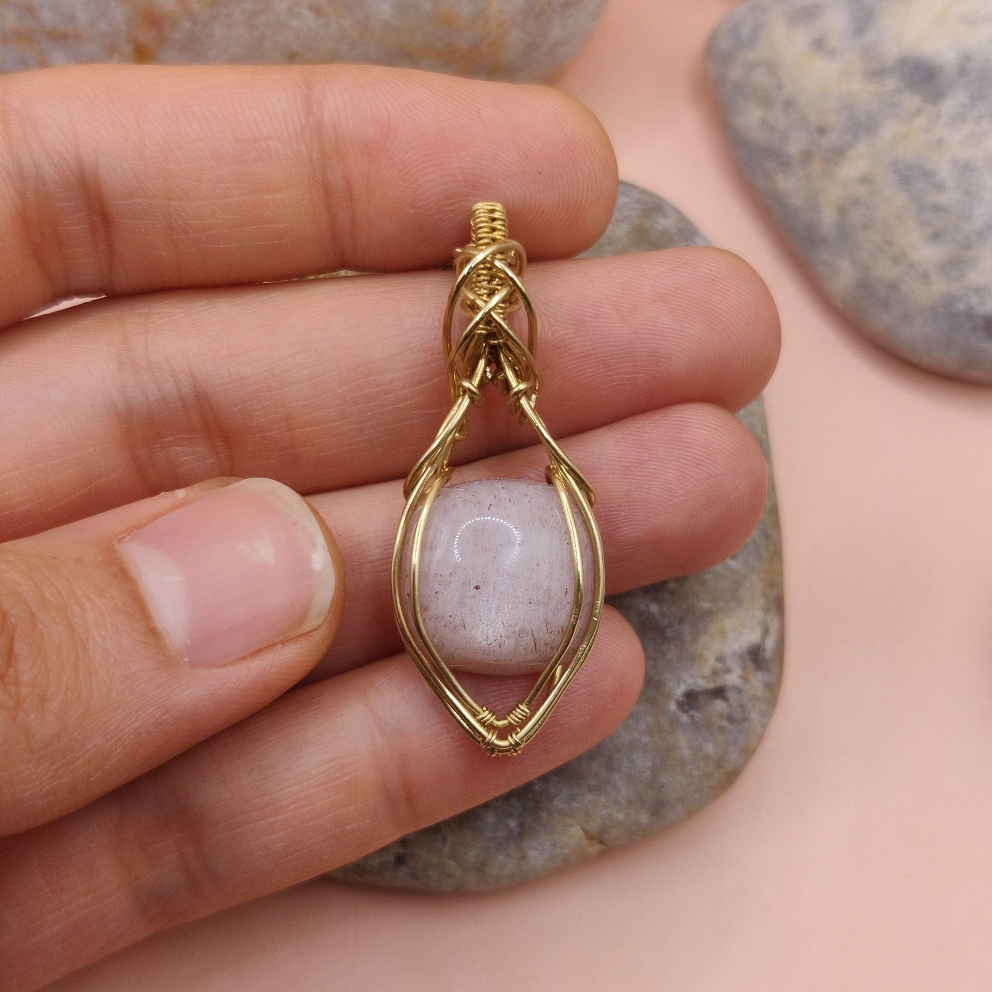 • Handmade with a natural peach moonstone pendant and brass wire