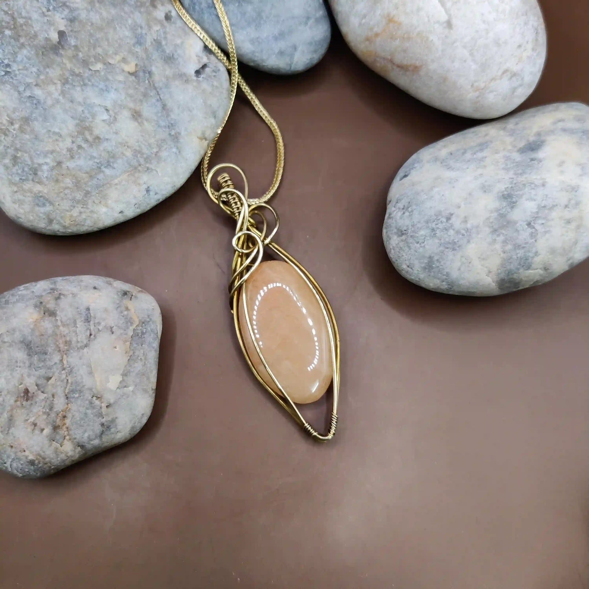 Embrace inner strength and confidence with this unique pink amazonite necklace. Delicately wrapped in brass wire, this powerful stone is believed to balance emotions and encourage clear communication. The soft pink hue adds a touch of elegance, making this necklace a perfect accessory for any outfit.